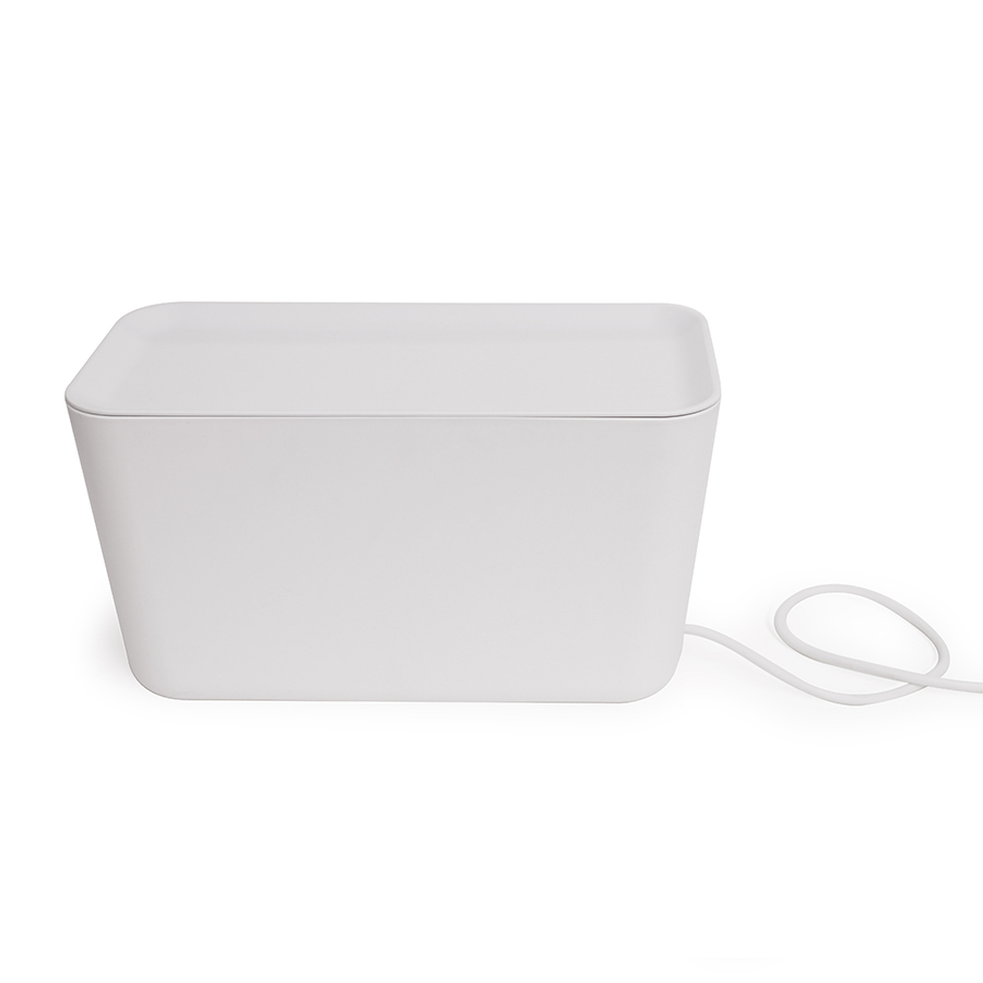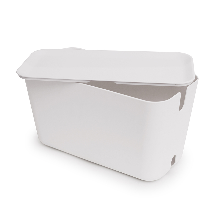 Органайзер для проводов CableBox XXL – это сверхвместительная модель, предназначенная не только для хранения кабелей, но и для электронного оборудования (маршрутизаторов, Wi-Fi-роутеров, игровых приставок и пр.). Он выполнен в том же стиле, что и все остальные модели серии, однако имеет несколько функциональных особенностей. Большая крышка может использоваться в качестве подставки под различную технику, а доступ к кабелям здесь осуществляется через новую кабельную розетку, расположенную на задней стороне коробки. Основные преимущества: • Скрывает удлинители, заглушки и адаптеры; • Обеспечивает надежное хранение электрических проводов; • Изготовлен из огнестойкого пластика; • Оптимальные габариты позволяют хранить большое количество кабелей и не загромождать пространство помещения; • Оснащен силиконовыми ножками для защиты поверхностей от царапин; • Крышка с функцией щелчка крепко удерживает шнуры и зарядные устройства; • Нижняя часть выдвижного ящика имеет вентиляционные отверстия. CableBox имеет полностью продуманную конструкцию, которая обеспечивает ему отличную надежность и высокий уровень безопасности. Он идеально подходит для хранения большого количества проводов и зарядных устройств. Кроме того, органайзер можно использовать как с заземленными, так и с не заземленными удлинителями.