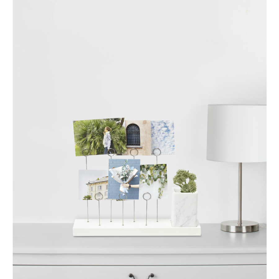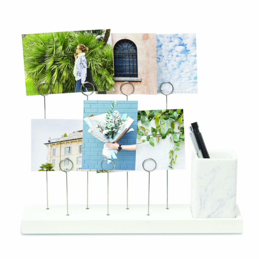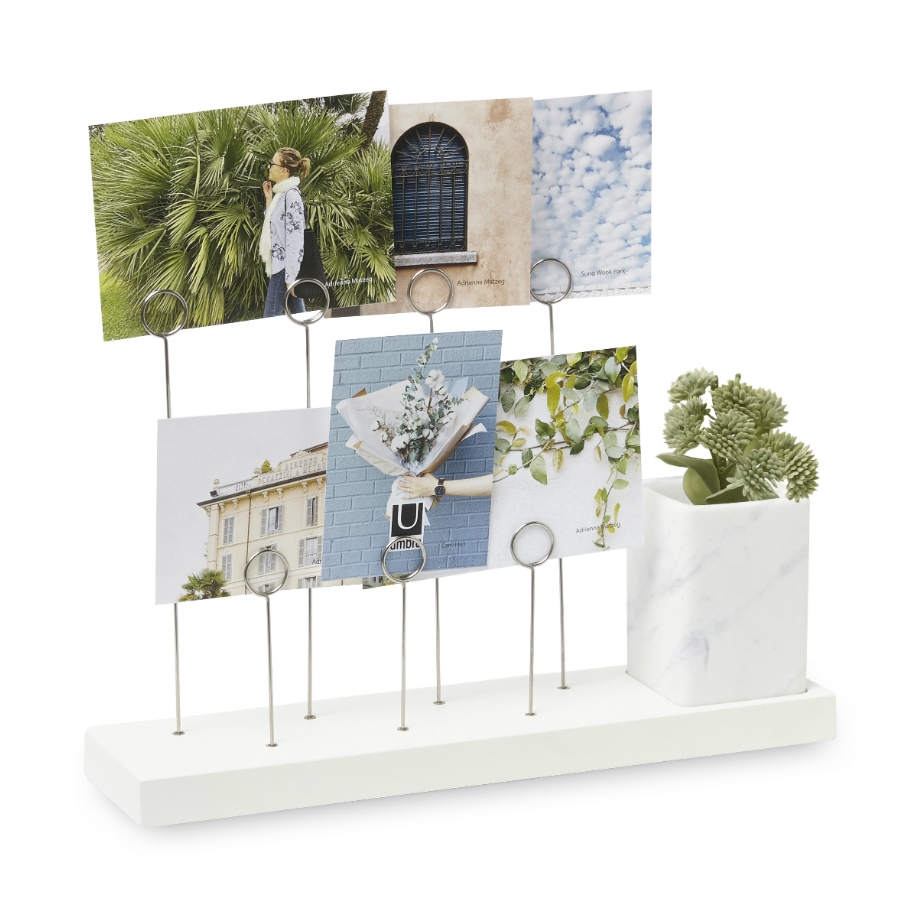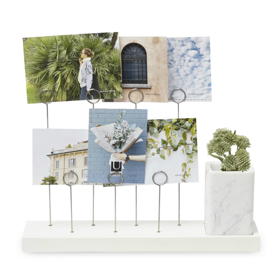 Оригинальное панно для фотографий Gala, которые крепятся на семи разноуровневых металлических зажимах в виде колец. Зажимы встроены в основание из натурального дерева. В комплект также входит съемное керамическое кашпо для комнатного растения, свежесрезанного цветка или канцелярских принадлежностей/ Дизайн: Sung wook Park.