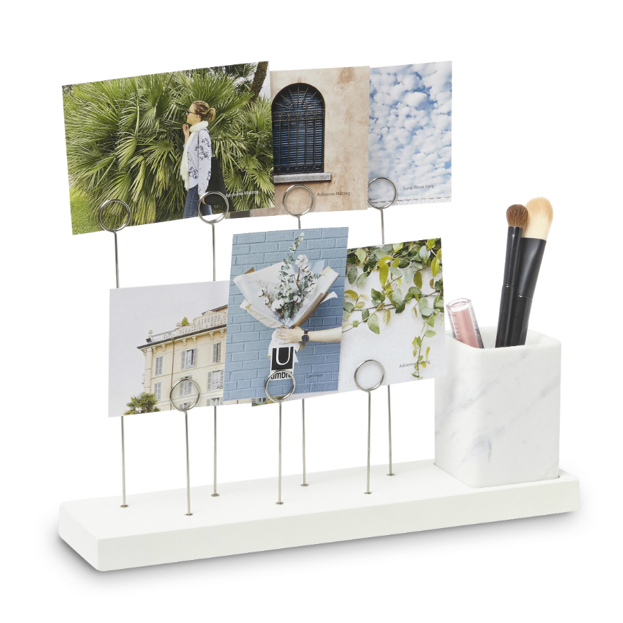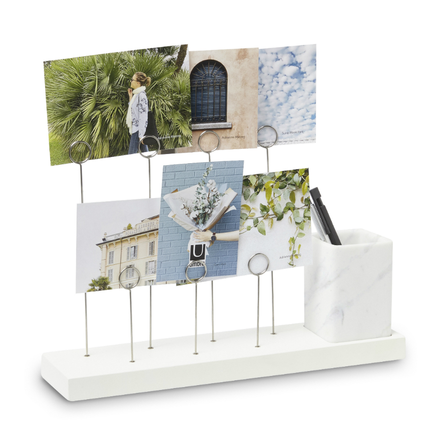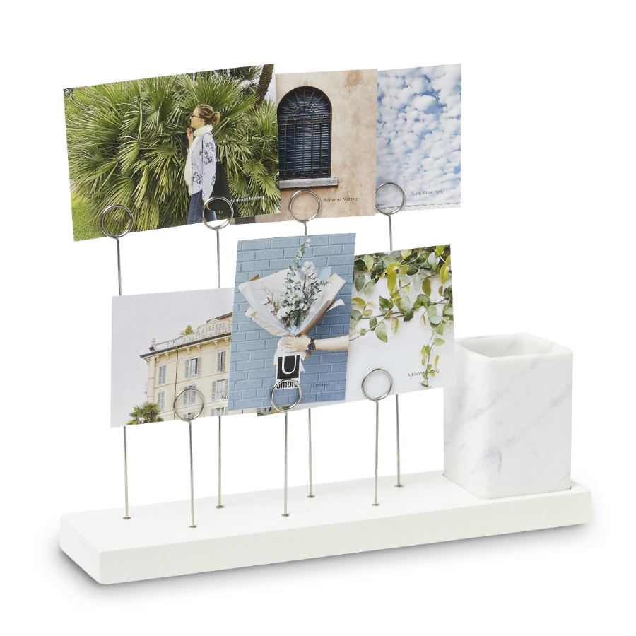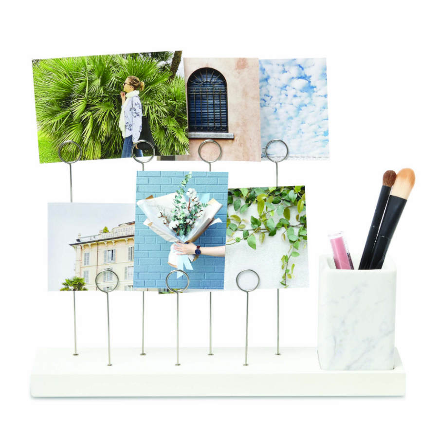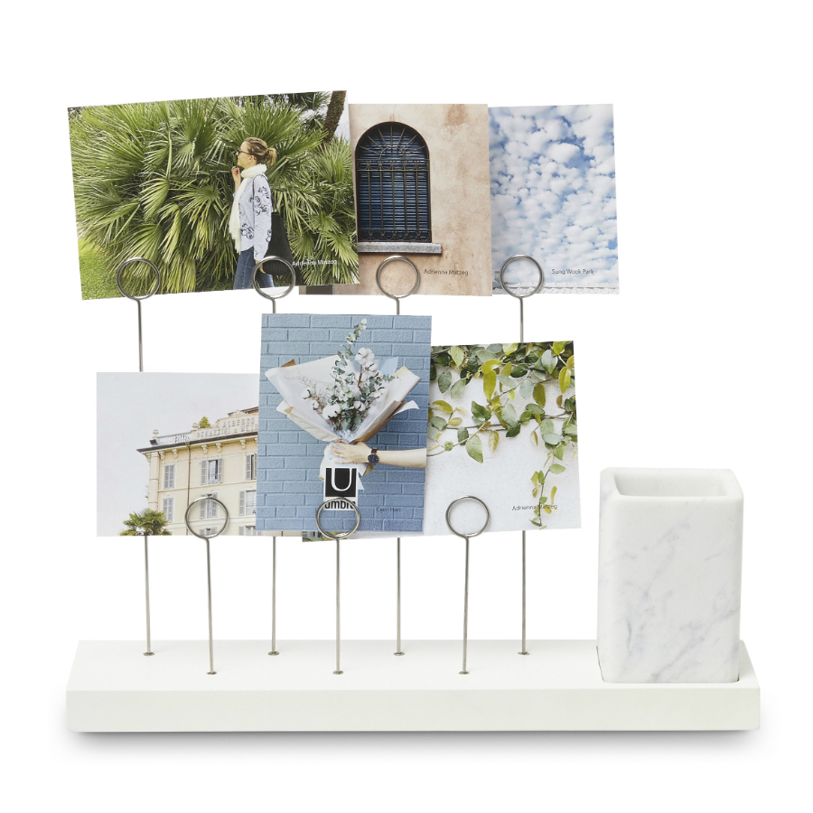 Оригинальное панно для фотографий Gala, которые крепятся на семи разноуровневых металлических зажимах в виде колец. Зажимы встроены в основание из натурального дерева. В комплект также входит съемное керамическое кашпо для комнатного растения, свежесрезанного цветка или канцелярских принадлежностей/ Дизайн: Sung wook Park.