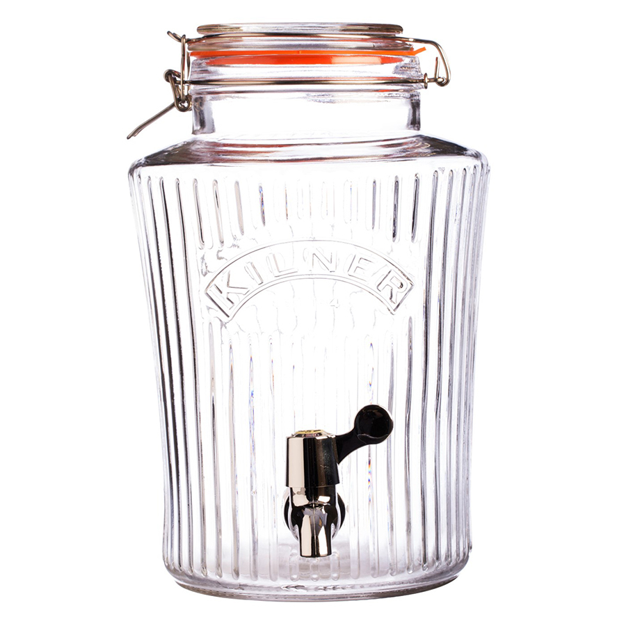 Диспенсер объёмом 5 л незаменим для вечеринок дома или на открытом воздухе. Он отлично подойдет для сервировки любых освежающих напитков: сок, лимонад, фруктовая вода, пунш, лонг-айленд ти, мохито. Диспенсер выполнен из стекла в ретро-стиле и украшен большим логотипом бренда Kilner. Он оснащен краном и удобной плотно закрывающейся крышкой. Диспенсер для холодных напитков особенно пригодится в жаркое время года. Особенности: - объём 5 л - мерная шкала на стенке диспенсера - в ёмкость не рекомендуется наливать кипяток - необходимо мыть вручную