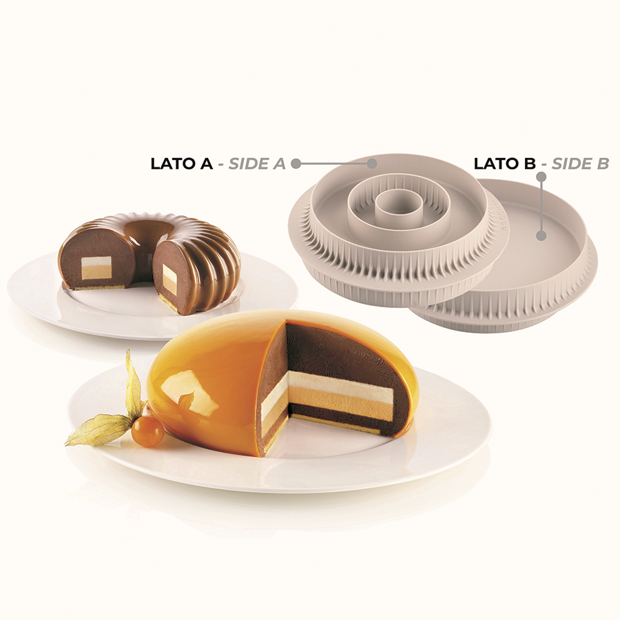 Двусторонняя форма для пирожных поможет удивить близких оригинальными многослойными десертами. Форма позволяет создать три декорации или вставки разных размеров: круглую вставку объемом 18 мл, круглую вставку 600 мл и вставку 300 мл. Украшайте десерт, сочетая разные вкусы и цвета. Форма выдерживает температуру от - 60 до + 230 °С. Силикон не содержит вредный бисфенол-А и соответствует европейским стандартам качества. Он не имеет запаха и не дымится во время готовки. Материал гибкий, прочный, устойчивый к перепадам температур. Форма выдерживает до 3000 использований. Перед использованием необходимо смазать изделие маслом. Объем: 918 мл. При чистке не используйте острые предметы, не режьте десерты прямо в форме. Можно мыть в посудомоечной машине при условии, что не используются агрессивные средства с осветляющим или ароматическим эффектом, это приводит к появлению на форме белых пятен и налета. Контакт с такими продуктами, как кокосовое масло и томаты, приводит к появлению пятен, которые легко устранить, положив форму на час в духовку, разогретую на 200-220 °С. Для удаления жира достаточно прокипятить около 10 минут. Подходит для хранения в холодильнике. Производство: Италия