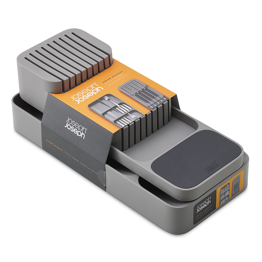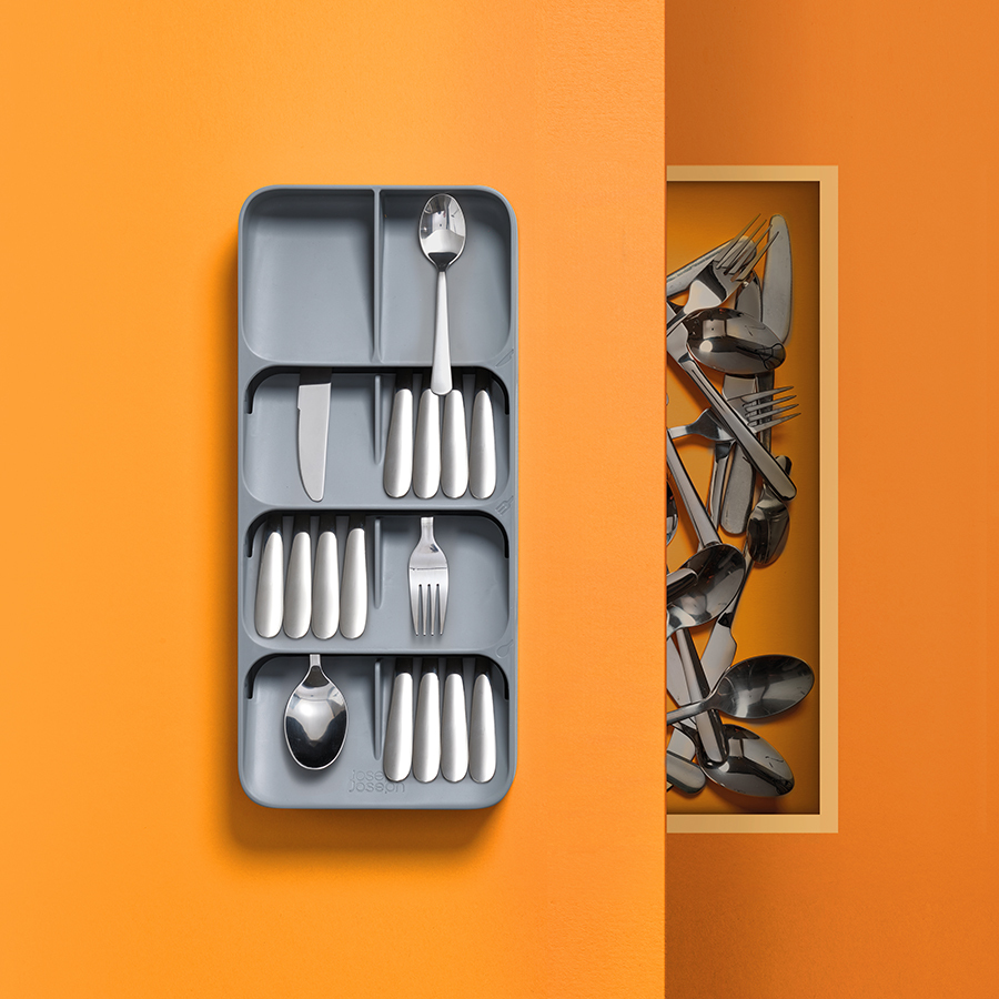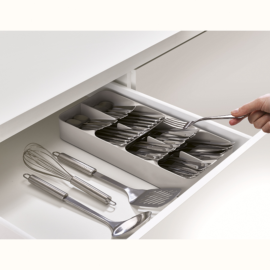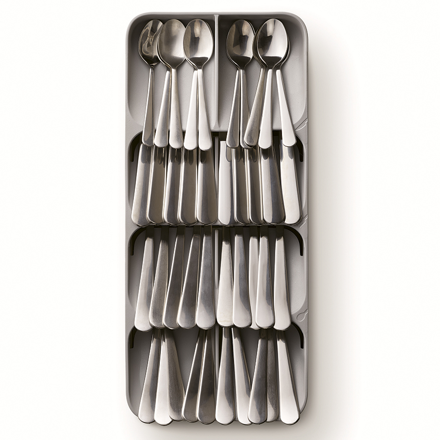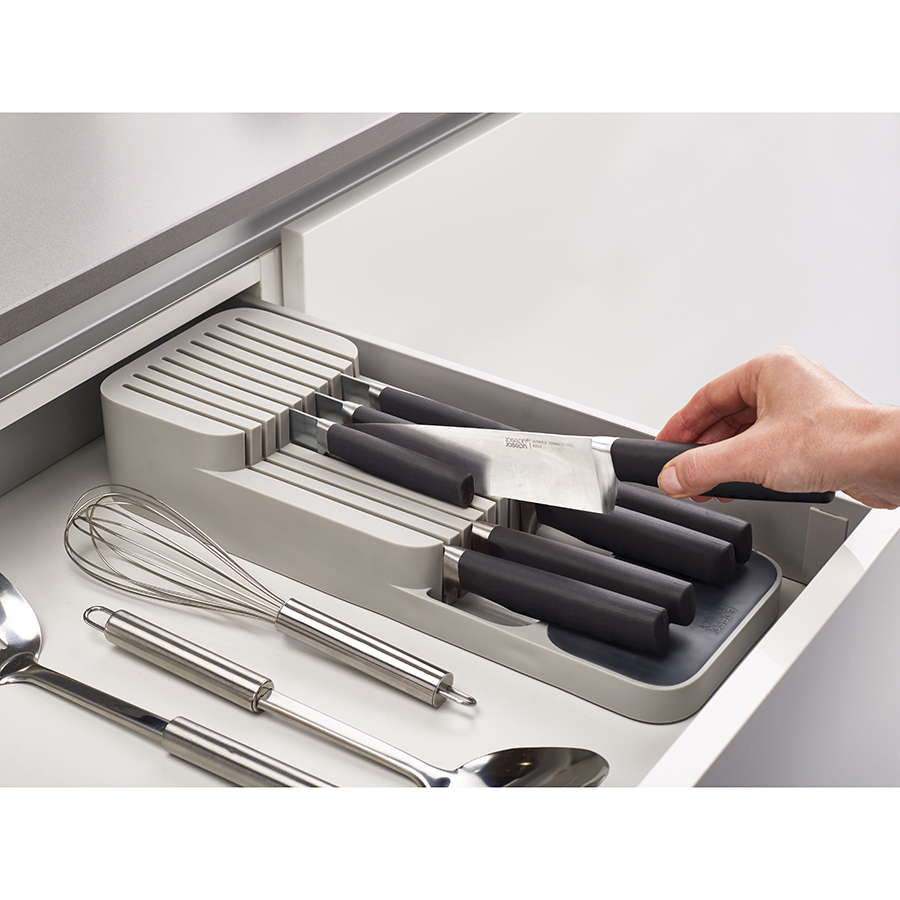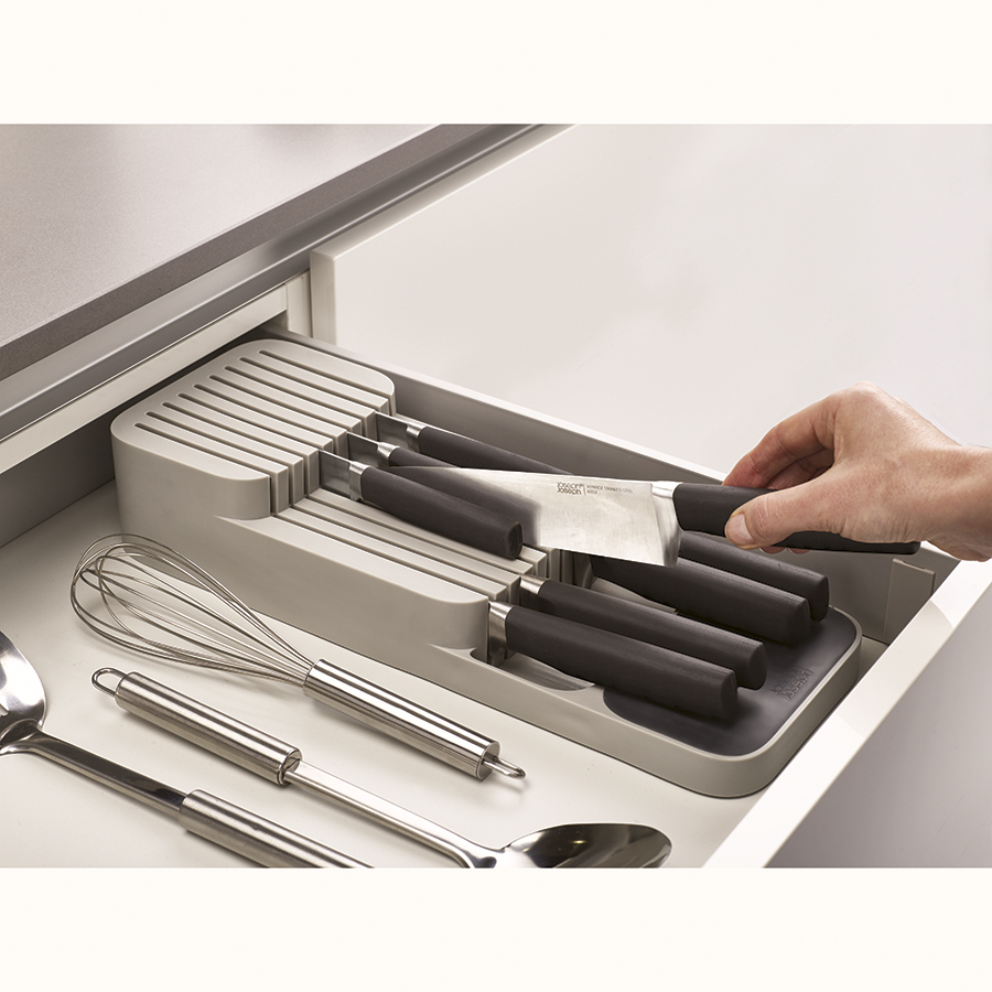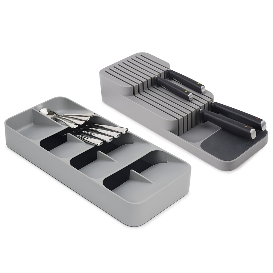 В 8-ми секциях органайзера компактно помещается более 48 столовых приборов: вилок, ножей, столовых и чайных ложек. Для легкого распознания приборов отсеки дополнены удобными иконками. Аксессуар подходит для ящиков с высотой не менее 8 см. На 2-х уровнях органайзера для ножей расположены держатели для безопасного и компактного хранения изделий с лезвиями разной длины: от коротких фруктовых и овощных ножей до длинных разделочных и универсальных. Органайзер рассчитан на количество до 9-ти ножей. Оба органайзера имеют силиконовые ножки, которые обеспечивают плотное сцепление с любой поверхностью.
