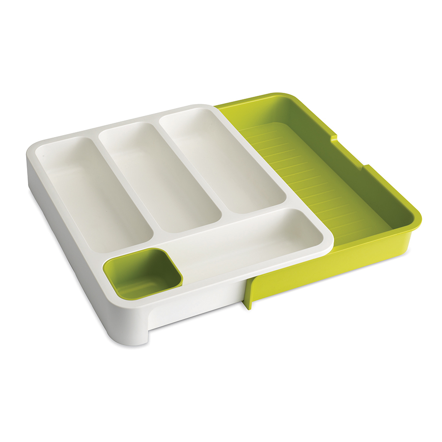 Две съемные части лотка регулируются под кухонные ящики самых разных размеров и надежно закрепляются в нужном положении. Органайзер состоит из четырех глубоких ячеек для ложек и вилок, вместительного отделения для ножей и крупных кухонных инструментов, а также небольшого съемного контейнера для различных мелочей. Подходит для кухонных ящиков шириной от 29 см. до 48 см.