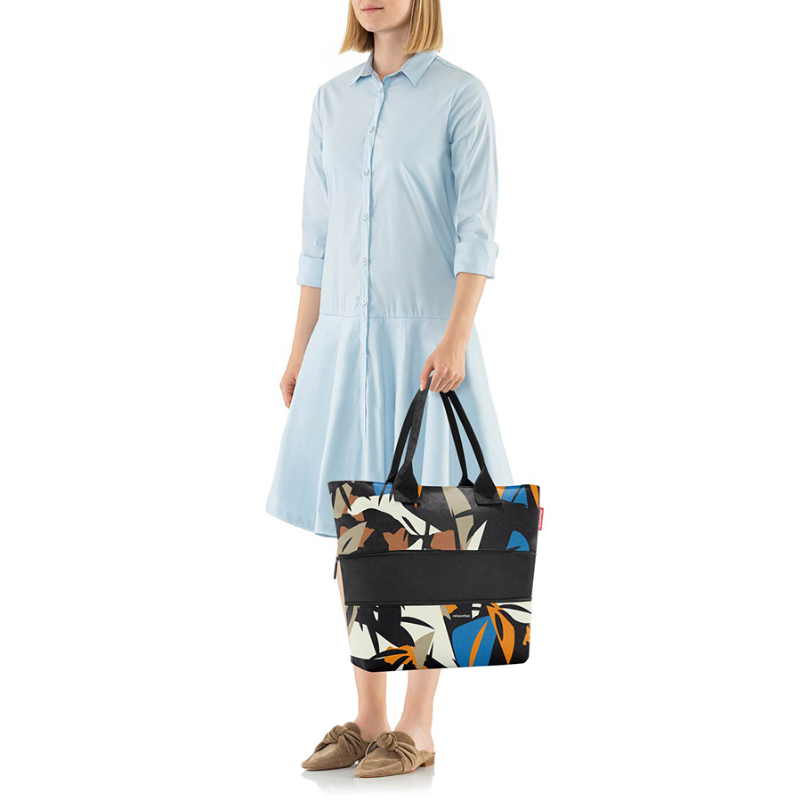 Shopper E1 – это дорожная, прогулочная и пляжная сумка. Коллекция Miami black – это сумки со смелым абстрактным принтом, ярким и сдержанным одновременно. В центре - специальная молния, расстегнув которую вы увеличиваете вместимость (в обычном состоянии - 12 литров, в разложенном - 18 литров). Внутри сумки карман на молнии для мелочей. Две ручки позволяют удобно повесить её на плечо. Материал – прочный водоотталкивающий полиэстер.