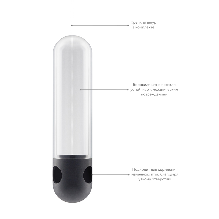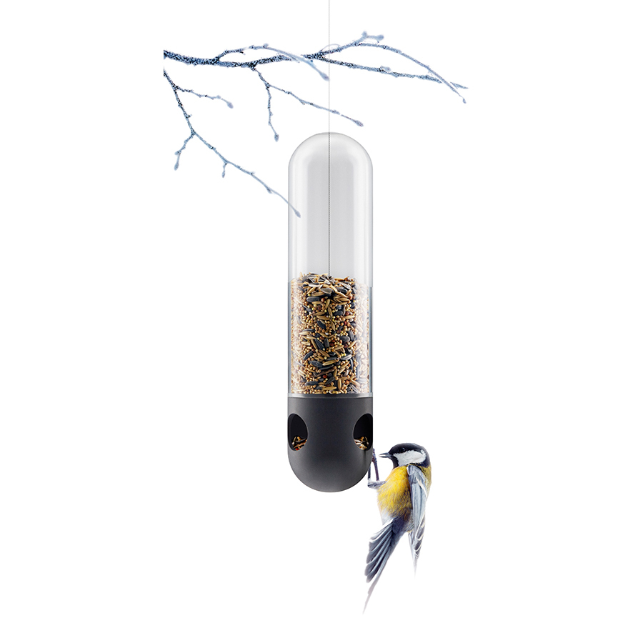 Такая кормушка пренназначена для небольших птиц - корм засыпается внутрь, и она подвешивается на дерево или к балке дома. Корм расходуется по мере того, как птицы склёвывают его внизу, а запас находится в сухости и безопасности за стеклом. Кормушка не боится морозов, и её легко мыть, в том числе в посудомоечной машине.
