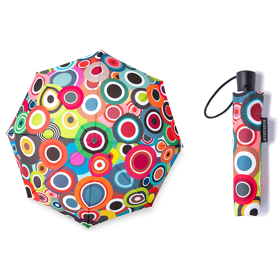Компактный зонт поместится в любую сумку. Прочный каркас выдерживает порывы сильного ветра. Зонт оборудован кнопкой для быстрого автоматического открывания и складывания, а также резиновым браслетом для удобной переноски. В комплект входит защитный чехол.